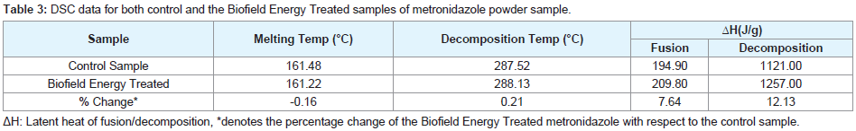 Table 3: DSC data for both control and the Biofield Energy Treated samples of metronidazole powder sample.
