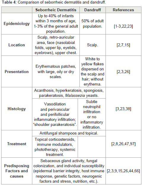 SD and dandruff are of a continuous spectrum of the same disease that affects the seborrheic areas of the body (Table 4). They share many common features and respond to similar treatments. Various intrinsic and environmental factors, such as Malassezia yeast, host epidermal conditions, sebaceous secretion, immune response, and the interactions between these factors, may all contribute to the pathogenesis. Effective management of SD and dandruff requires clearing of symptoms with antifungal and anti-inflammatory treatment, ameliorating associated symptoms such as pruritus, and general scalp and skin health to help maintain remission. Studies in humans and animal models to investigate the genetic and biochemical pathways will help identify new targets for the development of more efficacious treatment with less side effects, and better management of these conditions.Acknowledgements