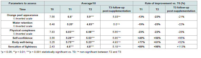 Participants rated six subjective parameters: orange peel appearance, water retention, physical complexes, self-confidence, body well-being, and sensation of lightness, on a 0-to-10 selfrating scale at baseline (T0), after one (T1) and two (T2) months of supplementation, and following a one-month observation period without supplementation (T3).