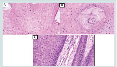 whorled dyskeratotic and atypical keratinocytes, and (C) infiltration of