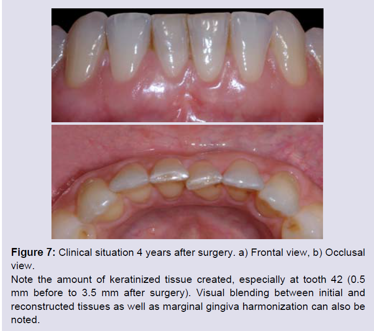 Figure 7: Clinical situation 4 years after surgery. a) Frontal view, b) Occlusal view.Note the amount of keratinized tissue created, especially at tooth 42 (0.5 mm before to 3.5 mm after surgery). Visual blending between initial and reconstructed tissues as well as marginal gingiva harmonization can also benoted.