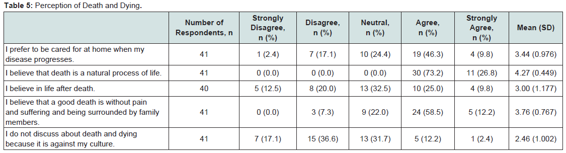 Table 5 summarizes participant’s perspective related to death and dying. All participants believed that death is a natural process of life, scored a mean score of 4.27 (SD = 0.449). Most participants believed that a good death is one that occurs without pain and suffering and where one can be surrounded by family members, received a mean score of 3.76 (SD = 0.767). A majority of the participants had a neutral perspective towards believing in the life after death, and this scored amean score of 3.00 (SD = 1.177).