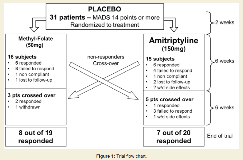 Thirty six out-patients referred to the Departments of Psychological Medicine at King’s College and Northwick Park Hospitals with a DSM-111-R Depressive Episode of mild to moderate severity and a Montgomery Asberg Depressive Score (MADS) [9] of at least 14 were entered into a pilot randomised controlled trial of 50 mgs 5-MTHF (consisting of a racemic mixture of 25 mgs of active L-isomer and 25 mgs of inactive D-isomer) against 150 mgs Amitriptyline. Exclusion criteria included clinical evidence of cognitive impairment; other psychiatric disorders; serious physical illness; alcohol/drug abuse; and pregnancy.Patients were referred for assessment and treatment in these two hospital out-patient settings, i.e. secondary care, by their general practitioners because of failure to respond to treatment in primary care. Those patients still on psychotropic medication underwent a two-week wash-out period. All patients had an initial run-in period of two weeks on placebo in an attempt to exclude placebo-responders from the active phase of the trial. Five patients were excluded. Thirty one placebo non-responders were then randomised blindly either to 5-MTHF (50 mgs) or Amitriptyline (rising to 150 mgs daily over one week) for six weeks. Non-responders to initial active treatment were then crossed over to alternative active treatment for a further six weeks. Patients failing to respond to both treatments were withdrawn. Patients responding to initial or cross-over treatment were followed for up to six months without any change of therapy (Figure 1).
