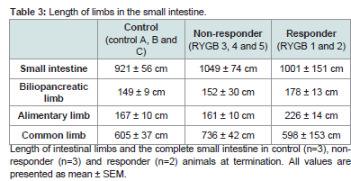 A main limitation in our study was the lack of sham-operated control animals. However, we consider it unlikely that the observed adaptations occurred as a response to anesthesia and the extensive manipulation of the visceral organs only, which is supported by data from rats demonstrating no effect of sham surgery on intestinal volume or L-cell numbers when compared to naive controls [9,10].