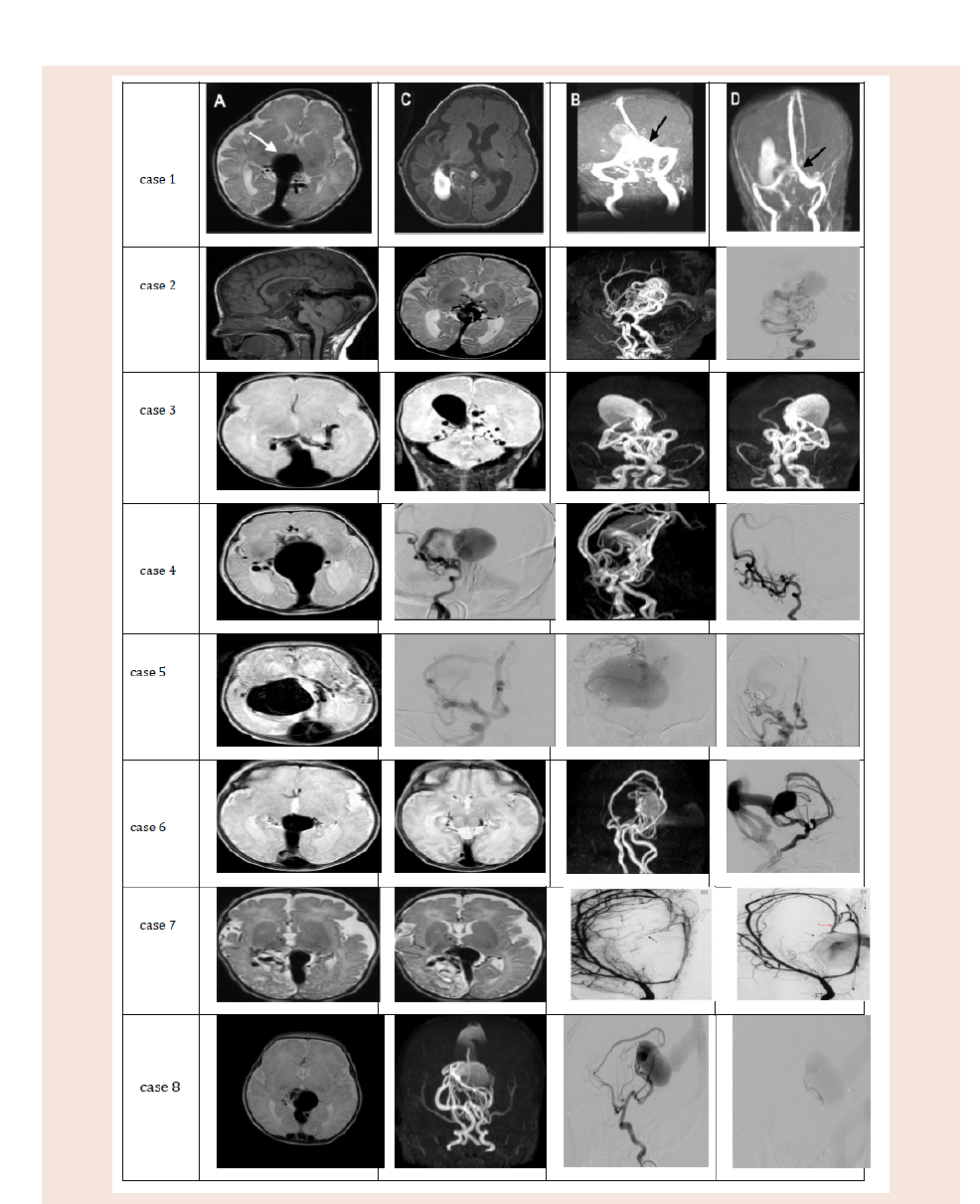 Results: Seven of 8 patients had an antenatal diagnosis. In all cases severe heart failure and pulmonary hypertension were present from the first day of life and hypotension, multiorgan failure, hydrocephaly and seizures developed in the following days. VGAM and its feeder arteries were mapped by cranial magnetic resonance imaging and magnetic resonance angiography. Transarterial embolization therapy was performed on 7 patients, of whom four babies survived and three babies died, while one patient died before any intervention.