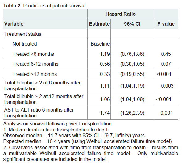 Only longer duration (> 48 weeks) of treatment (mono/combination) was independently associated with improved graft (HR 0.3, p=< 0.001) and patient survival (HR 0.33, p=< 0.001) (Figure 2). The impact of a number of variables on patient and graft survival was examined (Table 1). Independent predictors of poor graft and patient survival included serum total bilirubin levels of >2 at 6 and 12 months post-transplant and AST/ALT ratio >1 at 6 months (Table 2).