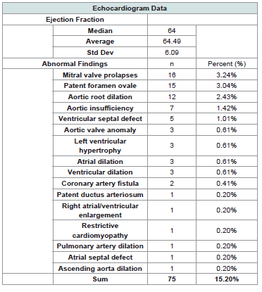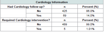 for these patients.Most patients were not seen by a Cardiologist based on their ECHO findings (n=425, 86.0%; [Table 3]. For those seen by Cardiology, common plans included repeat follows up at various intervals (1, 2 or 3 years usually), repeating an ECHO with follow up, outpatient monitors for arrhythmias, and genetics referrals for CTD workup. Of the few seen by Cardiology, even less required cardiologic interventions (n=5, 1%). Interventions included heart catheterization, starting medications (atenolol and losartan), two radiofrequency ablations, and one dual chamber transvenous pacemaker placement.