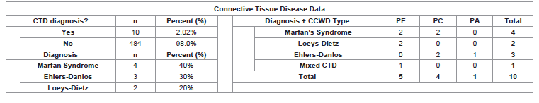 Conclusions: Patients with CCWD benefit from screening ECHOs in order to find cardiac anomalies that could impact pre, intra, and post-operative management. Findings could also initiate the workup for CTD and Cardiology involvement, further improving patient care.