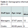 A total of 45 food service staff members (30 cooks and 15 managers) participated. The majority of the managers were white (80%, n=12) and 20% (n=3) were black. On the other hand, a majority of the cooks (70%) were black and 30% were white. All of the participants were female. Other demographic information for the participants is shown in (Table 2).In response to the interview questions, four main themes emerged, in addition to other issues raised by the food service staff. First, there was a clear need for more space and personnel to implement the new menu. Second, food service staff was resistant to change and did not fully support the new menu. Third, there was confusion regarding the healthfulness of the new menu. Finally, there was a concern for serving what the students preferred, and how the changed menu was leading to food waste.
