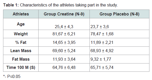 Results 1At the beginning of the study, the two groups (creatine and placebo), did not presentany statistically significant difference related to age, weight, % fat, lean mass, fat mass and fastest time in 100 m freestyle (Table 1).Gain of weight, mostly lean weight due to creatine supplementation, is widely described in the literature and generally attributed to water retention (also due to the short period between measurements - 7 days) [12,13]. But, in the placebo group, was found almost the same reduction detected in the creatine group, due to the training period (early season) where athletes were not in their best form yet.
