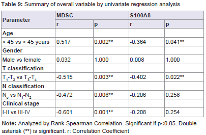 The expressions of MDSC and S100A8 were positively correlated with T classification (p=0.003 and p=0.022) and age (p=0.002 and p=0.041). The MDSC expression also correlated with N classification (p=0.006), and clinical stage (p=0.001). Contrary for S100A8 expression were not correlated with N classification (p=0.258) and clinical stage (p=0.254) (Table 9). The result indicated that he high expression of MDSC was correlated with clinical stage of nasopharyngeal carcinoma especially in blood.