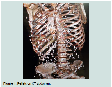 - and abdominal vascular structures [1].The severity of short gun wounds depends upon distance of the victim from the weapon. The patients who were hit by pellets (Figures 1 and 2); the penetrating injuries of the viscera were minimal as its velocity decreases rapidly after the shell leaves the barrel of the gun. When the distance is less than 3 yards the injury is considered as high velocity if the distance exceeds 7 yards most of the buckshot only penetrates the subcutaneous tissue. In this reference we saw the mixed pattern of such injuries that were managed conservatively and the ones with high velocity injuries were taken for operative management. The wounds that resulted into the blunt trauma caused by other than missiles were also grievous in nature however not typically penetrating yet impalement injuries were found in few (Figures 3 and 4).