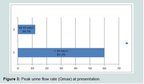 All patients recruited into the study had uroflowmetry at presentation and peak urine flow rate (Qmax) was determined for each patient and recorded. Some investigations (urinalysis, urine microscopy culture and sensitivity, abdominal ultrasound, serum urea, electrolytes and creatinine, and serum prostatic specific antigen) were done on all the patients, others such as prostatic biopsy, urethrocystoscopy were done where indicated. Results of all the investigations were recorded.