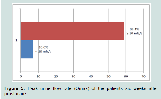 The estimated prostate size (by abdominal ultrasound) of the patients at presentation is shown in Figure 2: Majority of the patients had Qmax of less than 10 mls/s at presentation as shown in Figure 3: Table 1 shows the QOL scores the patients had if they were to have their LUTS for the rest of their life. After six weeks on prostacare capsules, majority of the patients recorded a significant improvement in the LUTS as shown in Figure 4.