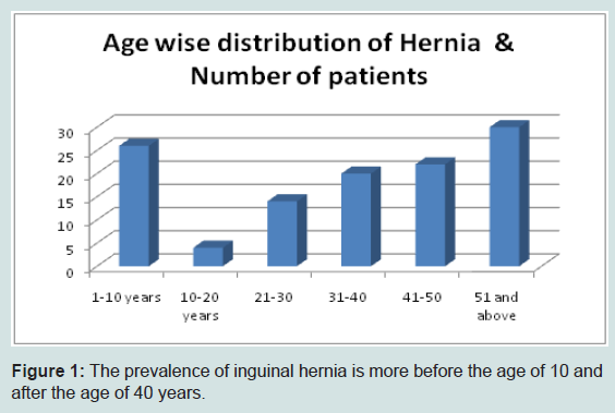 Figure 1: The prevalence of inguinal hernia is more before the age of 10 and after the age of 40 years.